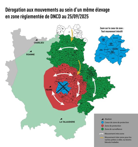 Particularité pour le Cœur de Zone : aucun mouvement vers l'abattoir, ni au sein de l'élevage en cas de
